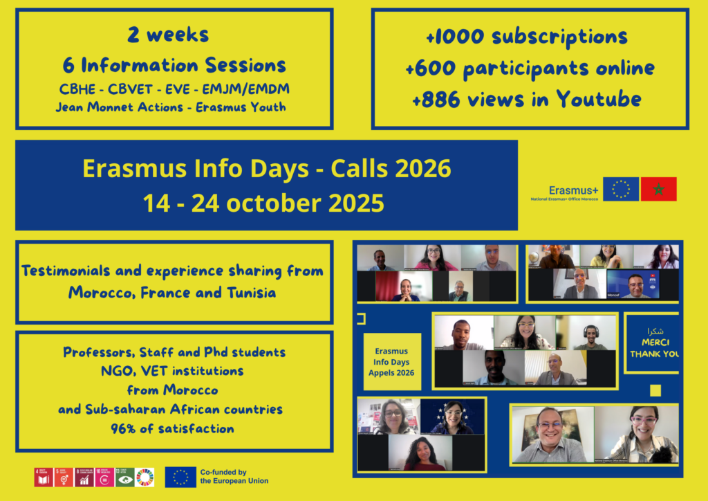 Le Bureau Erasmus+ Maroc organise diverses activités pour la promotion des actions Erasmus+ et des appels à projets, de suivi et d’accompagnement et de valorisation des résultats des projets et d’ouverture.