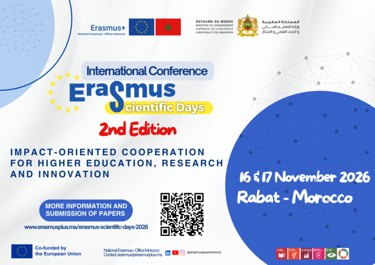Following the outstanding success of the first edition of Erasmus Scientific Days held in October 2022, which brought together 230 participants from 50 universities across 30 countries in Europe, Africa, Asia and Latin America, 54 papers, highlighted 20 Erasmus+ projects results, and led to the publication of a scientific volume, the National Erasmus+ Office in Morocco, in partnership with the Ministry of Higher Education, Scientific Research and Innovation and the Delegation of the European Union to Morocco, is pleased to announce the Call for Papers and Contributions for the 2nd edition of the Erasmus Scientific Days, under the theme: “Impact-Oriented Cooperation for Higher Education, Research and Innovation”.