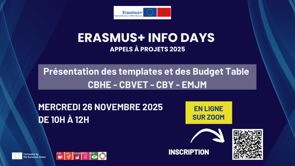 Après la présentation des différentes actions sur deux semaines (voir ci-dessous), le Bureau national Erasmus+ Maroc organise une session d’information en ligne, le mercredi 26 novembre 2025, de 10h à 12h, dédiée à la présentation des templates et des budget tables des principales actions de renforcement des capacités et de coopération du programme Erasmus+.